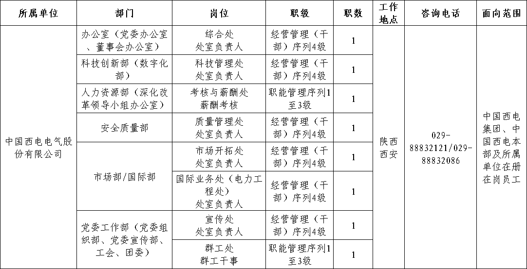 本次面向公司内部公开招聘岗位信息如下: