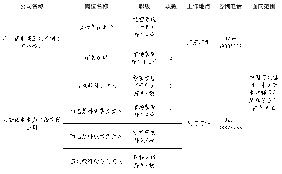 本次面向公司内部公开招聘岗位信息如下: